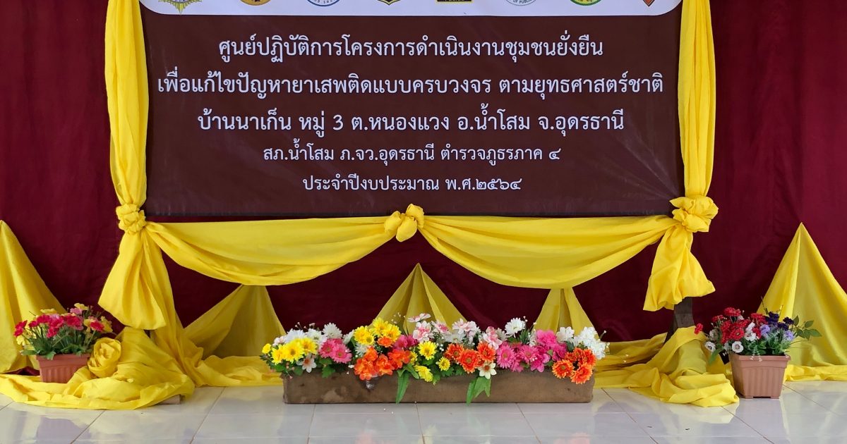 #สภ.น้ำโสม วันนี้ 6 กรกฎาคม 2564 เวลา 10.30 น. พ.ต.อ.เชี่ยวชาญ มีชัย ผกก.สภ.น้ำโสม, พ.ต.ท.อภิราช สนิทวงศ์ชัย รอง ผกก ป.ฯ,พ.ต.ท.พรมมี โสระศรี รอง ผกก. (สอบสวน)ฯ คณะครู รร.บ้านนาเก็น กำนันตำบลหนองแวง,สอบต.ตำบลหนองแวง , อสม., และชุดปฏิบัติการโครงการดำเนินงานชุมชนยั่งยืนฯ จัดพิธีมอบบัตรพลเมืองสีขาวปลอดยาเสพติด ป้ายหมู่บ้านสีขาว ป้ายคุ้มสีขาว ป้ายบ้านสีขาว ให้กับผู้นำหมู่บ้าน หัวหน้าคุ้ม และประชาชนบ้านนาเก็น ตามโครงการดำเนินงานชุมชนยั่งยืน ณ รร.บ้านนาเก็น ต.หนองแวง อ.น้ำโสม จ.อุดรธานี